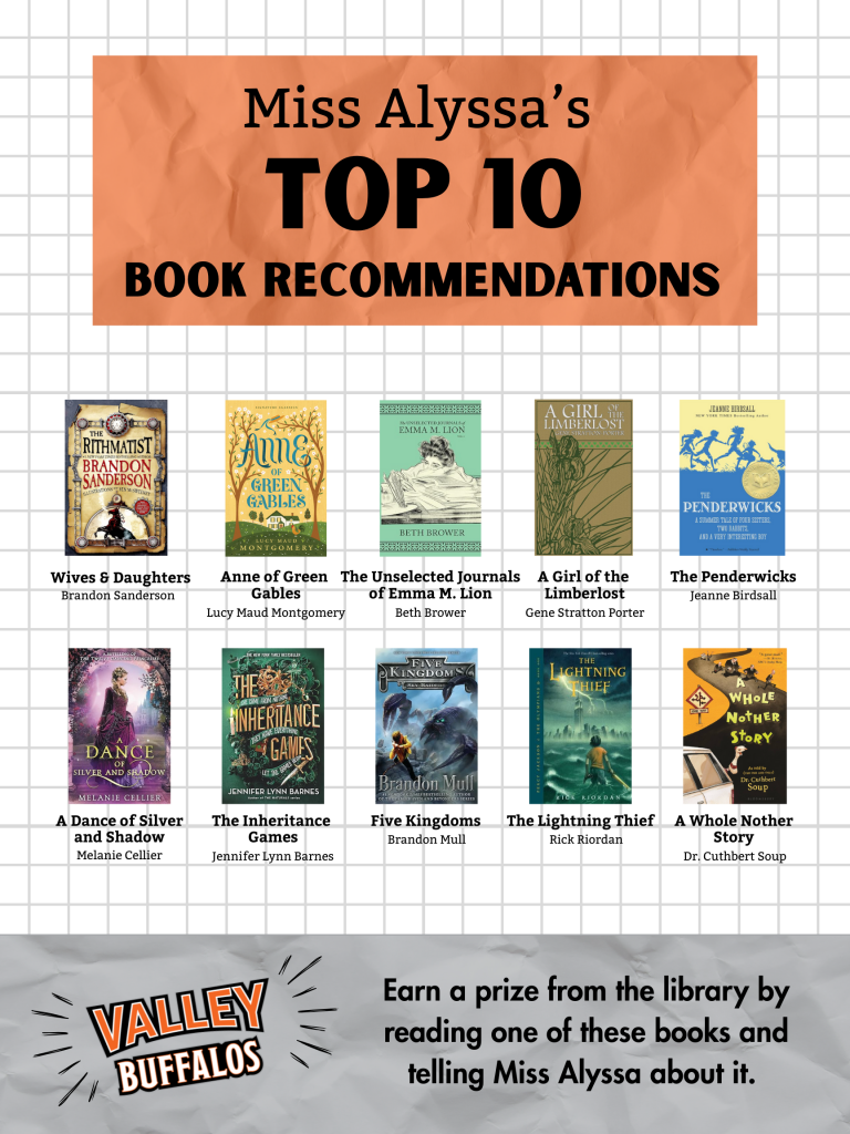 Each faculty member has a poster with their top ten book recommendations for students on the wall next to their classroom/office. To participate, read a book from a faculty member’s list and talk to them about it. Then, come to the library to claim your prize!