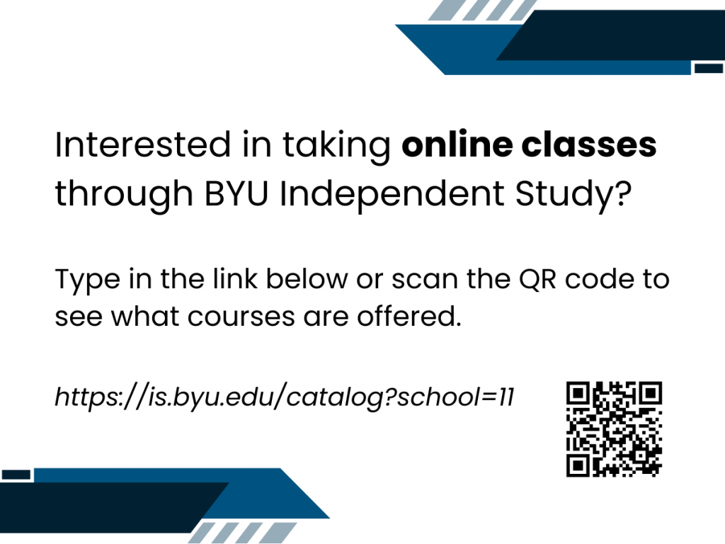 Students have the opportunity to enroll in BYU Independent Study classes with the approval of Mr. Heath and Dr. Chamberlain. Each class is a semester-long, but students have more flexibility to work at their own pace. Contact Miss Alyssa for more details.